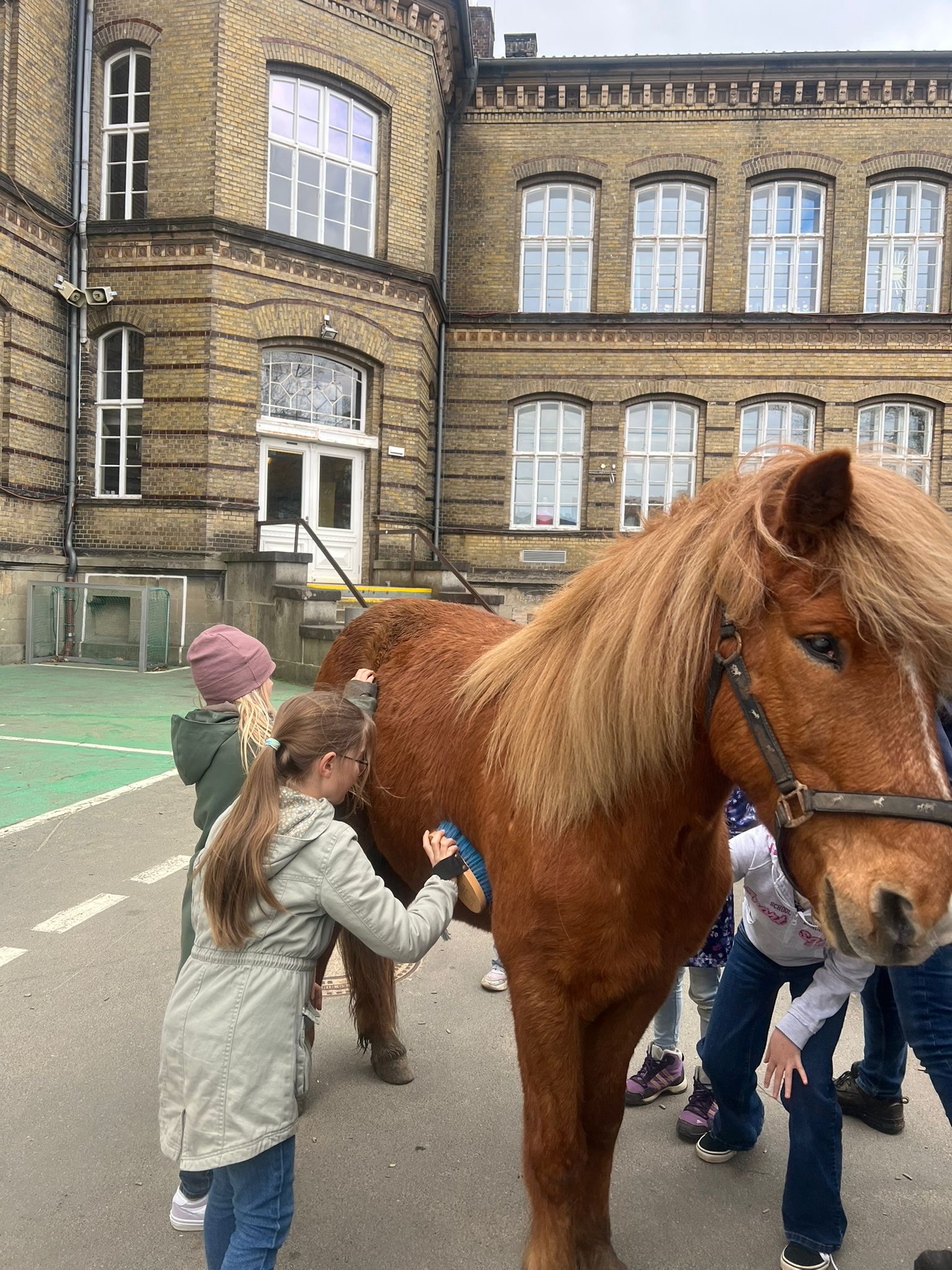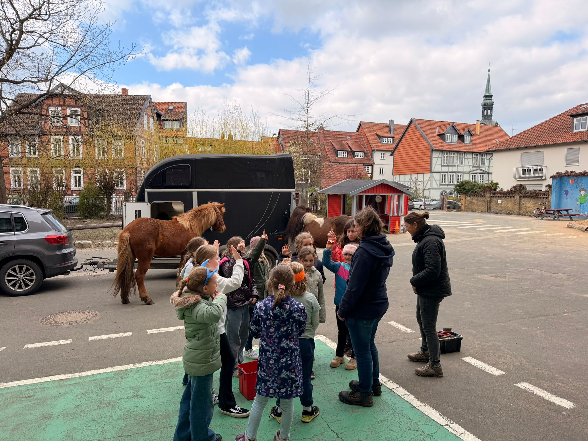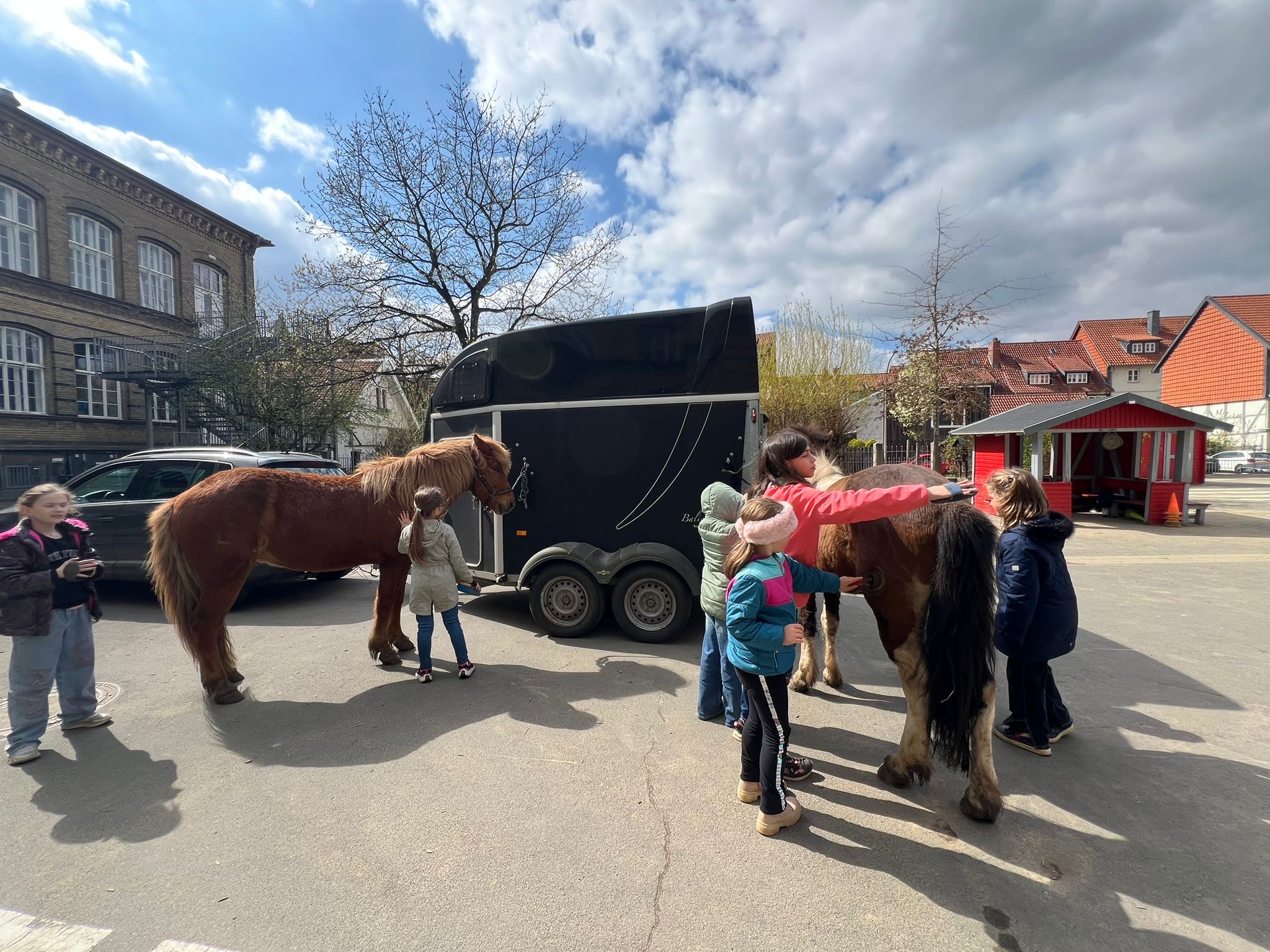 Unser „jüngster“ Kooperationspartner ist der Reitstall Dettum. Mehrfach waren auch unsere neuen vierbeinigen Pony-Freunde zu Besuch und die HufeisenAG im Ganztag durfte sich mit dem Thema Pferd und Pferdehaltung beschäftigen.